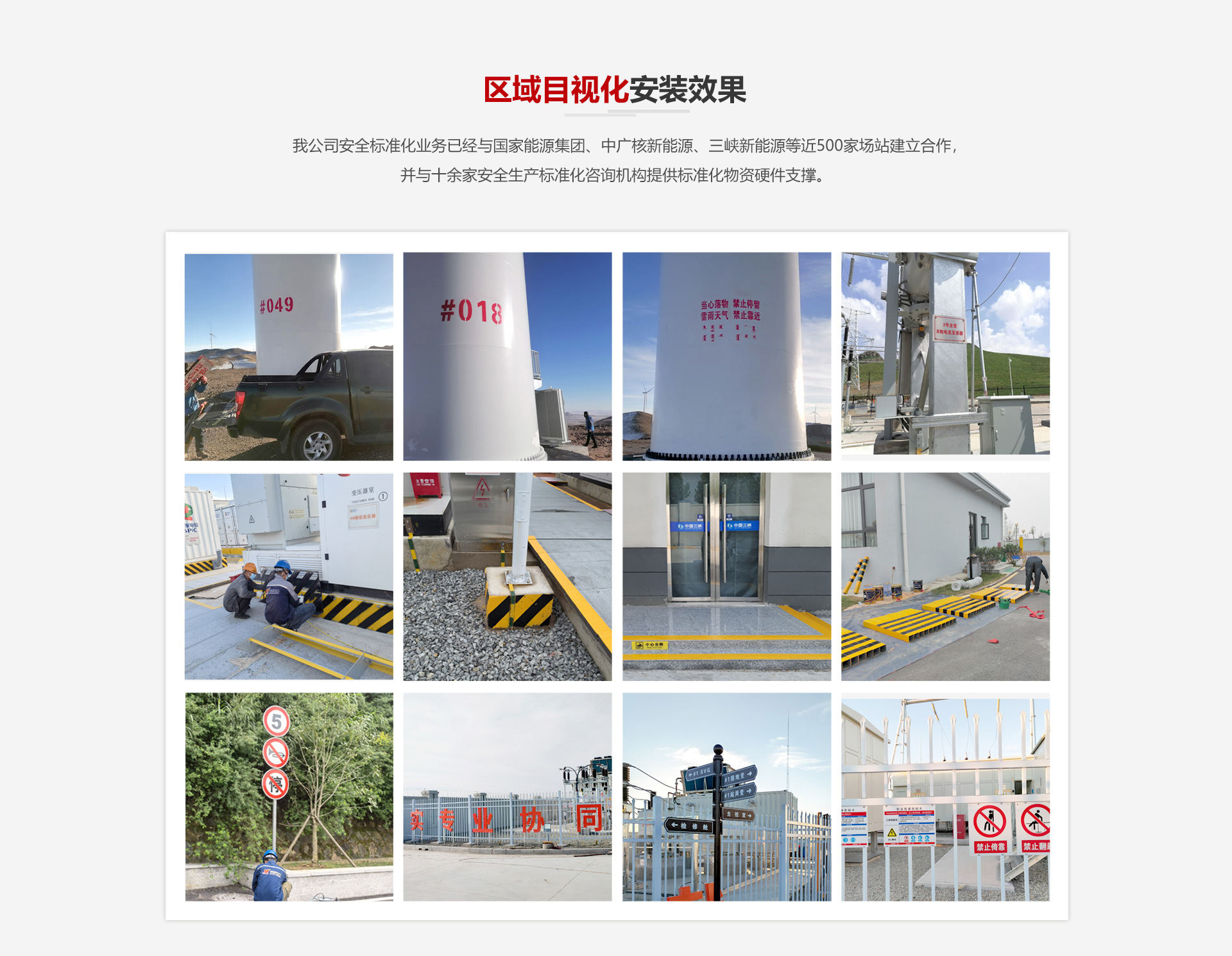 我公司安全標準化業(yè)務(wù)已經(jīng)與國家能源集團、中廣核新能源、三峽新能源等近500家場站建立合作,并與十余家安全生產(chǎn)標準化咨詢機構(gòu)提供標準化物資硬件支撐。