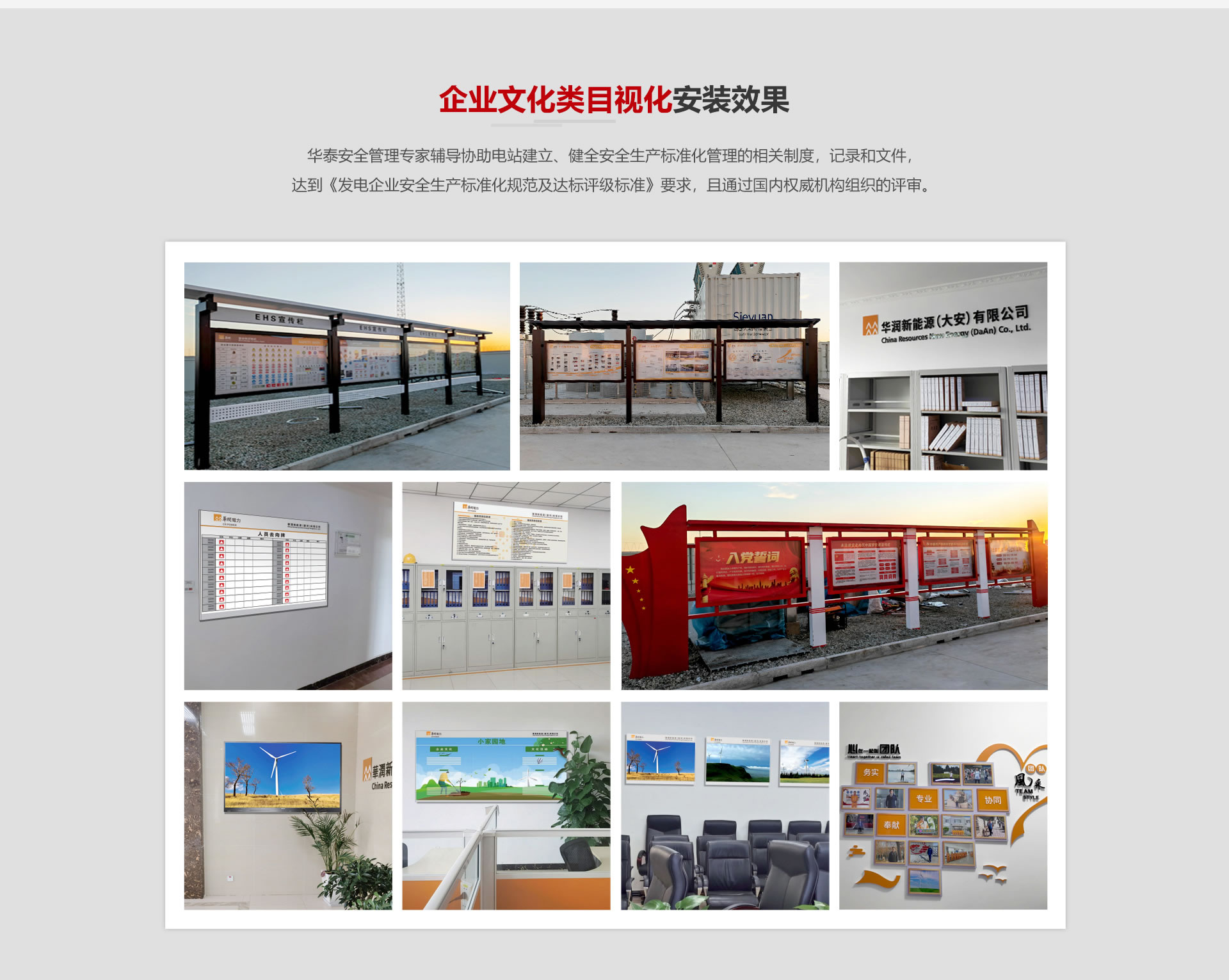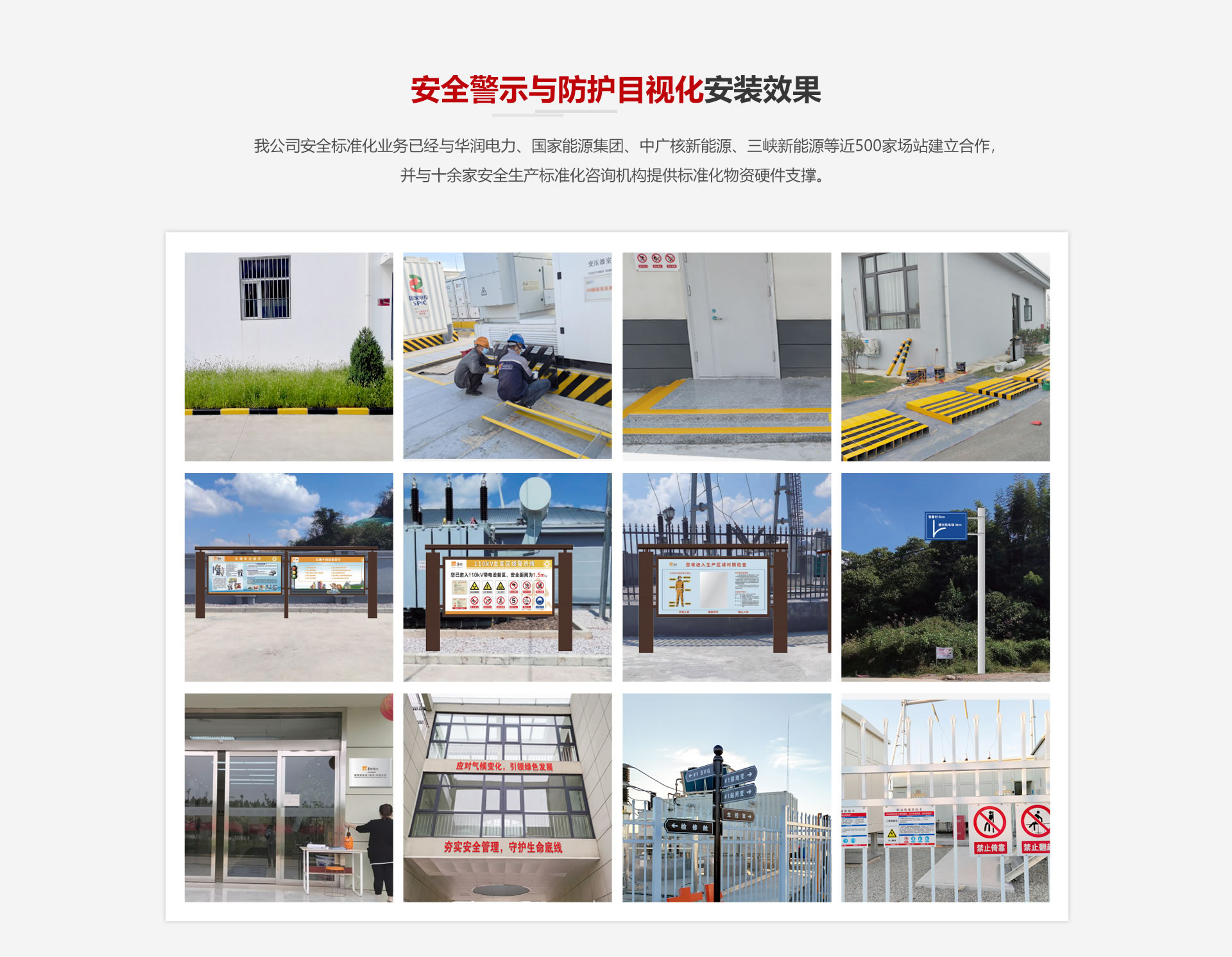 我公司安全標(biāo)準(zhǔn)化業(yè)務(wù)已經(jīng)與國家能源集團、中廣核新能源、三峽新能源等近500家場站建立合作,并與十余家安全生產(chǎn)標(biāo)準(zhǔn)化咨詢機構(gòu)提供標(biāo)準(zhǔn)化物資硬件支撐。