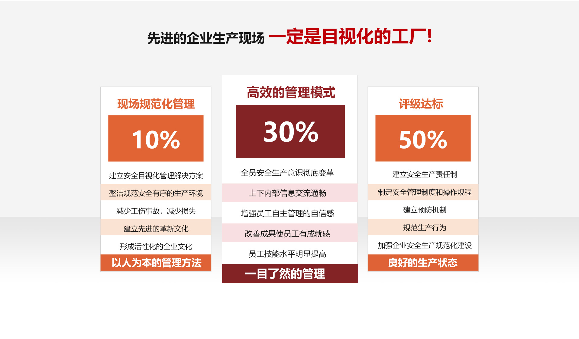 華泰安全目視化管理以安全法律、法規(guī)、標(biāo)準(zhǔn)和危害識(shí)別風(fēng)險(xiǎn)評(píng)價(jià)為基礎(chǔ),運(yùn)用標(biāo)識(shí)警示、6S管理、看板管理、定置管理等方法,結(jié)合企業(yè)VI、生產(chǎn)的特點(diǎn)、安全管理現(xiàn)狀,將各方內(nèi)容融合,策劃一套系統(tǒng)的安全目視化管理解決方案。