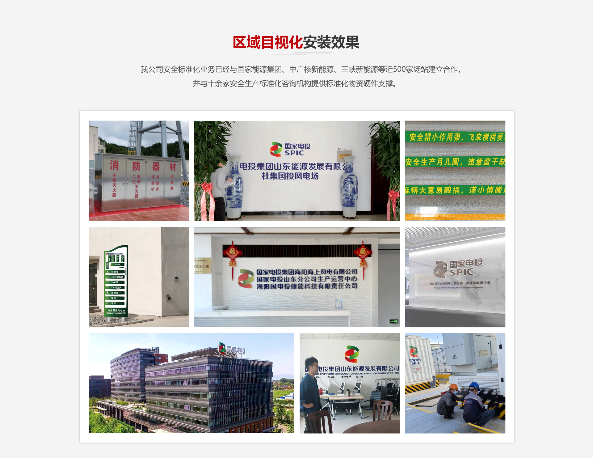 我公司安全標準化業(yè)務已經(jīng)與國家能源集團、中廣核新能源、三峽新能源等近500家場站建立合作,并與十余家安全生產(chǎn)標準化咨詢機構提供標準化物資硬件支撐。